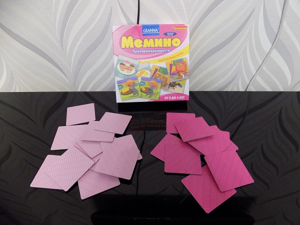 Простенькая игра на противоположности. Карточки раскладываются на две стопки по цвету рубашки. Потом одна из стопок переворачивается картинкой вверх, а из второй берется по одной карте. Первый кто найдет противоположную картинку из открытой стопки забирает обе себе. Самый наблюдательный выигрывает.