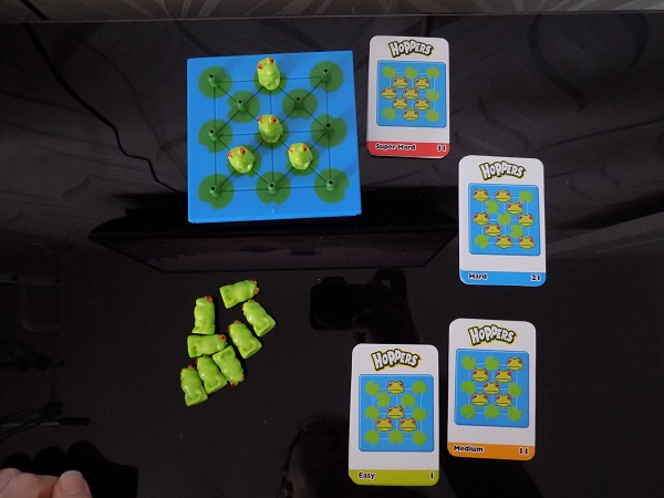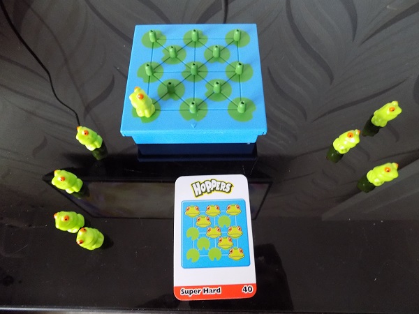 В игре четыре уровня сложности. Самый простой на фото. Всего 4 лягушки. Задача оставить на поле только одну.