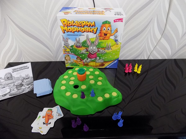 Цель игры довести команду зайчиков до верха горки где находится вожделенная морковка. Игра рассчитана на 4 игроков, у каждого игрока по 4 зайца одного цвета. В наборе карточки двух видов, с количеством шагов (от 1 до 3) и морковкой. С первыми все ясно, а вот если выпадет изображение морковки ее надо аккуратно повернуть. В некоторых местах появляются норы, в которые зайчики могут упасть, так что до финиша доберутся не все. Вот так кровожадно. )) Любимый момент сына в игре это как раз крутить морковку.