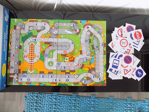 Игра достаточно замороченная и нет, она не на три года, если играть по правилам. Мы пока просто двигаемся к финишу попутно собирая карточки с дорожными знаками, если попал на соответствующую клетку. Кубик "светофор" не используем. Да и вообще, похоже мне сначала придется выучить все знаки и правила дорожного движения. ))
