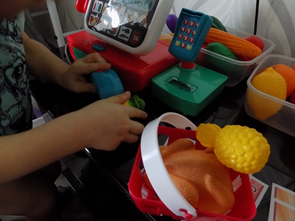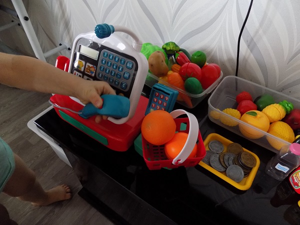 Держали меня и не удержали, я таки купила сыну кассу. )) Классная игрушка. Все издает звуки и пищит, сканер, громкоговоритель, карточка, отделение для денег. В наборе не много денег. Корзинка с продуктами и тремя бутылочками - кетчуп, растительное масло и вода.