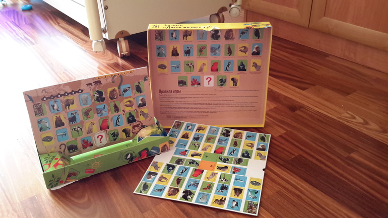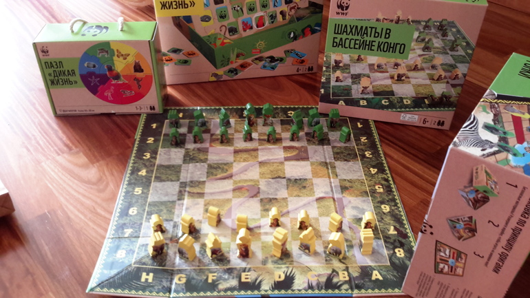 Шахматы с животными. Фигуры деревянные, а поле из очень плотного картона (дно коробки).