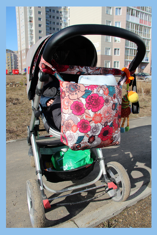 Еще из мелких нервирующих минусов - материал ручки. В дождь он сильно впитывает влагу и становится мокрый, как губка. Неприятно держаться за него, на перчатках, если они тканевые, остаются мокрые пятна. Решилось дело накладкой на ручку из искусственной кожи (заказывала у той же девушки, что шила нам козырек и сумку).