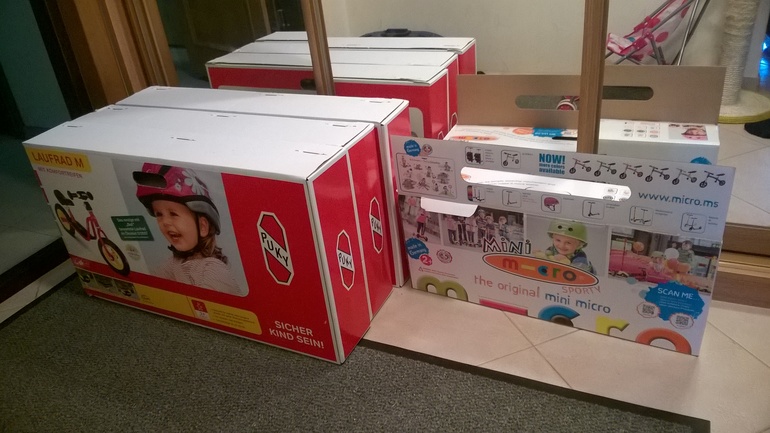 Теперь о доставке: доставка DHL в Россию до 4х негабаритных предметов фиксированная - 19.95 евро. Я нашла единомышленников. Доставку разделили на 3х. Получилось по 6.65 евро * 80.50 = 535 руб на человека! Согласитесь, доставка по родному городу 250-390 руб. По цене как две доставки в Москве!!! А по сути беговелы прибудут самолетом из Германии!!!