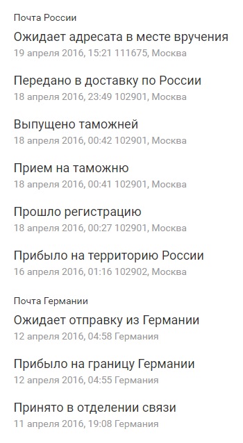 Сначала смотрим здесь по 12-значному номеру (который придет вам на е-мэйл), а когда в строке UPU Code / Matchcode появится буквенно-числовой трек, примерно такого вида CL*********DE, начинаем отслеживать у нас на сайте Почты России