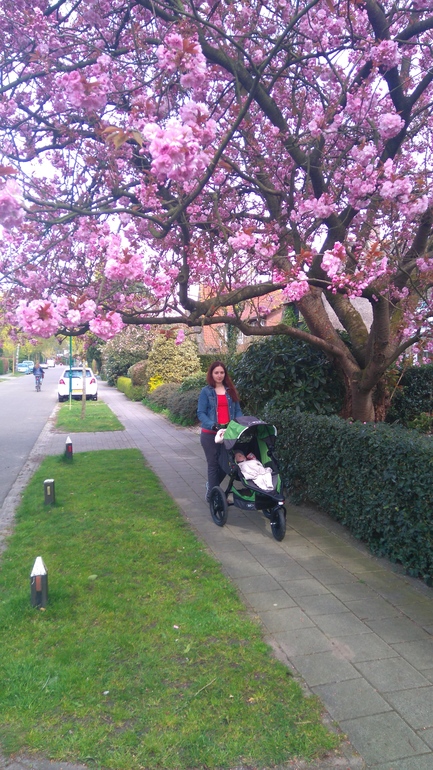 Какое красивое дерево с розовыми цветами!!! А зачем в 3,5 мес прогулочная коляска?