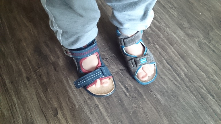 На правой ноге большой еще сандаль, я бы так не стала ходить (ну, ребенку бы не дала) по-моему, это неудобно, спотыкаться не будет?