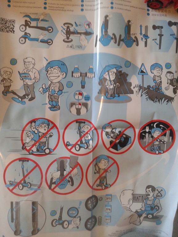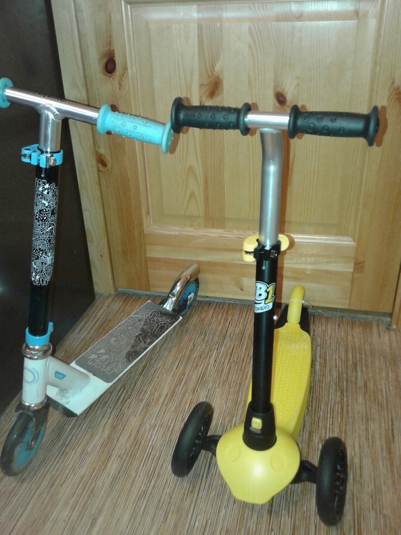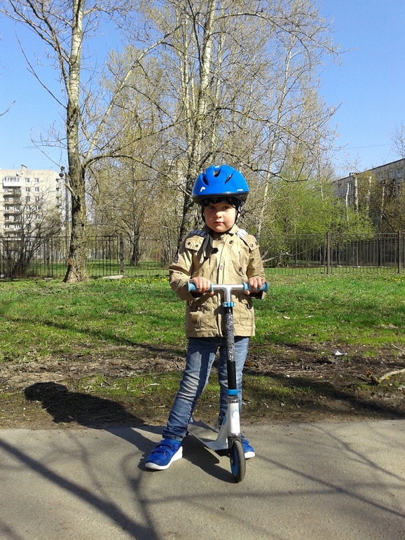 Первым был куплен двухколесный, подарили его старшему в честь рождения младшего в январе. Не важно, что был мороз под 30 градусов, нам же нужно было обменять на что-то коляски старшего. Поэтому, топая из сада по снегу, на возмущения "это моя коляска!" я напоминала, что "большие мальчики катаются на самокатах", и за пару-тройку раз вопрос с принадлежностью колясок закрыли. На самокате катался по подъезду.