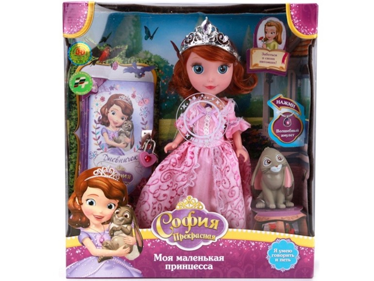 9. Прицела София. Качество, конечно, ее disney. Скорее русская версия или Китай. Нажимаешь на амулет, говорит разные фразы на русском. В комплекте резиновый кролик и блокнот с замком и коючом, который дочку и заинтересовал.