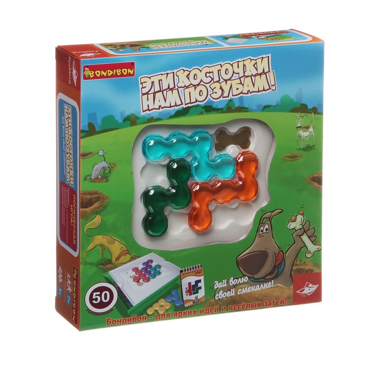 11. И последнее- игра, которая нам безумно понравилась- bondibon. Эти косточки нам по зубам. Внутри эти фигурки, косточки и блокнот с 50 заданиями. Надо выложить фигурки на косточку, как написано в задании и , переставлял по одной, открыть косточку. С каждым разом задания все сложнее. Ответы есть сзади каждого задания.