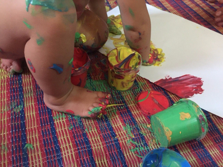 Ребенок (1 г 7 мес) сначала рисовала пальцами, потом брала в ручку огрмоное количество красок и рисовала себе на попе. Была вся к красках)
