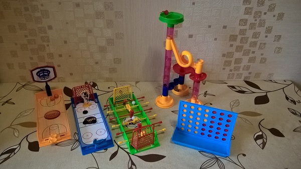 Футбол, баскетбол, хоккей. А также "Четыре к одному" и "Лабиринт с шариками". У двух последних отличный крепкий пластик. У спорт игр потоньше, но в общем норм.