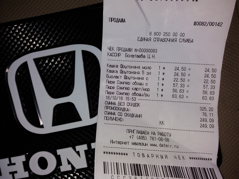 Случайно обратила внимание на чек ))я все пюре брала изначально со скидкой цены были от 80 до 98р.а по чеку совсем другие цифры. Вернулась обратно взяла еще банок 10 пробиваю на кассе и обращаю внимание что и тут цена ниже, спросила у них , говорят просто скидка. Я ей объясняю что ценник и так со скидкой, те получается на скидку накладывается еще скидка , кассир говорит нет, просто промоскидка.))) Пыталась ей несколько ращ донести то, что у мкня питание итак уже со скидкой) ну мне хорошо , экономия хорошая получилась) )) вместо 80-100 р заплатила 56-65р