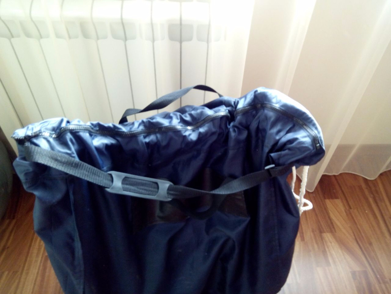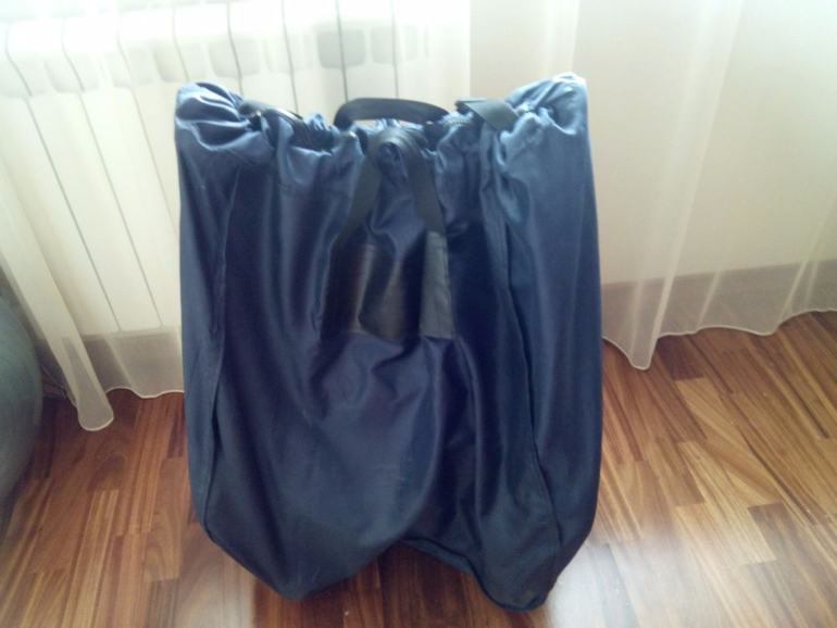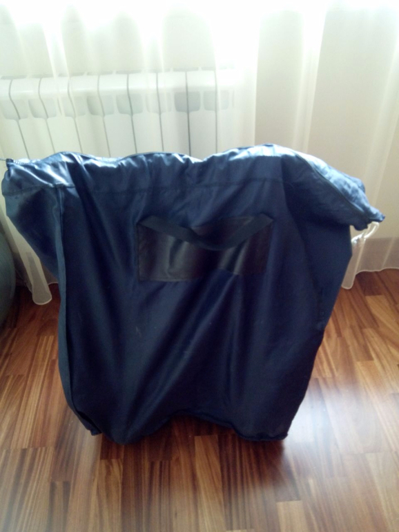 1. Наш чехол. Он затягивается. Можно достать плечевой ремень, когда мужу нужно её отнести или убираем ремень и остаются 2 ручки для сотрудников аэропорта. Чтобы усилить ручки, пришили полоски искусственной кожи.