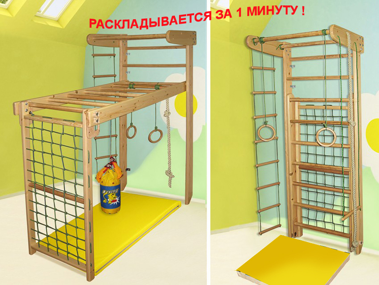 у нас есть шведская стенка с турником, уголок "лиана", навесное оборудование (лестница,кольца,канат,качели),горка и мат. Все из ясеня (самая дорогая комплектация). Ничего не шатается. Все надежно. У нас все стоит в разложенном виде. Убрать уголок несложно,но мы не убираем. Ребенку 4 года - лазить любит.