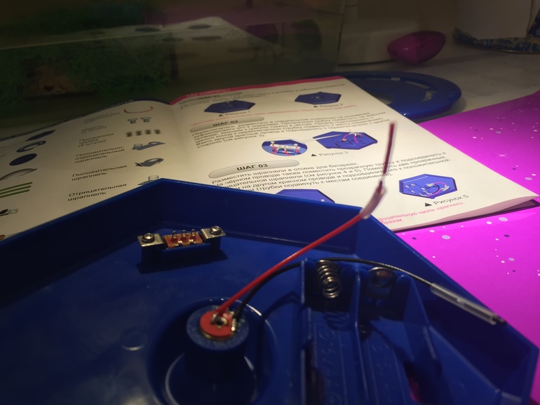 Домашний планетарий от бондибон . Его надо самим собирать. Там отсек для батареек, включатель, проводочки соединять надо. Моя дочка очень увлеклась. Рублей 700 стоит.