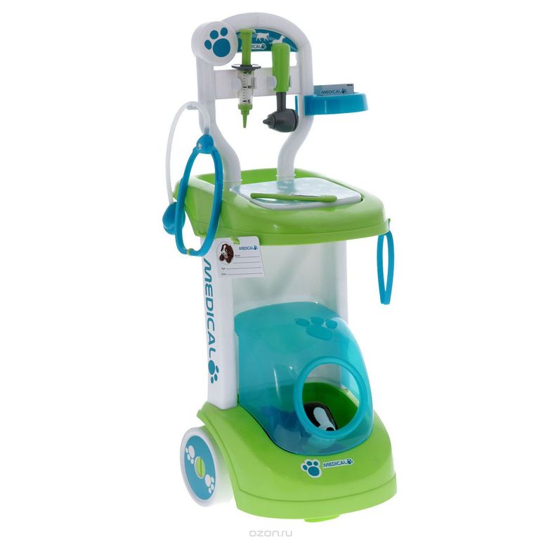 У нас похожая тележка, только не ветеринара, а доктора. Качество пластика отличное, играет более 2 лет, много раз подала, но все части целые. Электронный аппарат до сих пор издает звуки, хотя батарейки ставили лишь в самом начале.