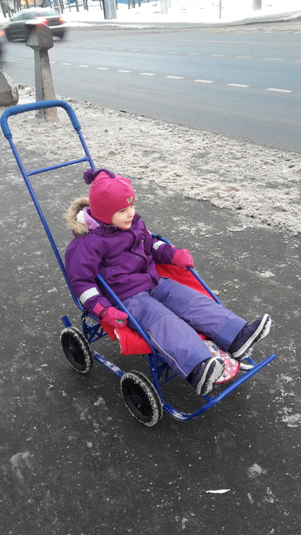 Тестдрайвы (кроме колясок)Вобщем мама задолбалась таскаться с коляской или обычными санками по нечищенным улицам Москвы в сад. Купили гибрид: санки с колесами. Универсани Су13. Здесь я конечно дала маху, заказала с самыми большими колесами, они действительно гигантские.