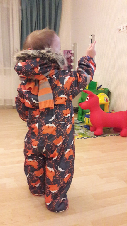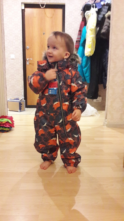 У нас такой же комбез, только сиреневый, и возраст почти такой же) носим сейчас, в 0 градусов. С обувью сидит хорошо, штанины нормально легли. А босиком как у вас))) думаю, можно начинать вам носить уже))