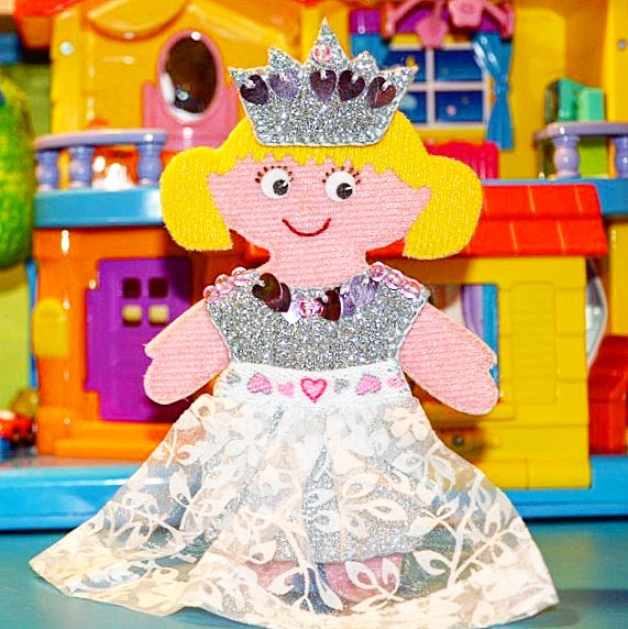Ага, сама кукла из велкроткани (заказывала из Питера:))), в Москве не сыскать), это мягкая часть липучки. Плюс два слоя розовенького фетра. Получается кукла и гибкая, и ничего с ней не сделается, мы ее и купали даже :). А одежда из фетра, всякие бусины, пуговички, ленты и т.д., чтобы ручонки все трогали да мелкая моторика развивалась. Фетр тоже разный использовала - и мягкий, и жесткий, опять же для разных тактильных ощущений. Для нарядного платья принцессы брала фетр с блестками (не крошатся) и тюль (остатки от икеевских занавесок). Для меня самой было сначала откровением, что дочь достает ее часто сама и пока, как умеет, наряжает :)