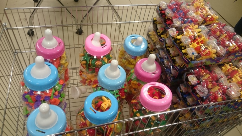 Есть большая бутылка - соска с маленькими машинками с драже.