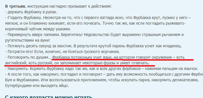 Выбор подарка ребенкуОГРОМНАЯ ПРОСЬБА ОСОБО "ОДАРЕННЫМ" ---НЕ ПИСАТЬ НИЧЕГО! ЖДУ АДЕКВАТНЫХ ОТВЕТОВ ОТ ВЛАДЕЛЬЦЕВ ФУРБАКК! СПРАШИВАЮ РАДИ ИНТЕРЕСА, МНЕ ВСЕ РАВНО ГОВОРИТ ОН ИЛИ НЕТ, КУПЛЕН ДЛЯ КОЛЛЕКЦИИ!!!