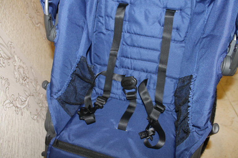 Коляска оснащена удобными пятиточечными ремнями безопасности.