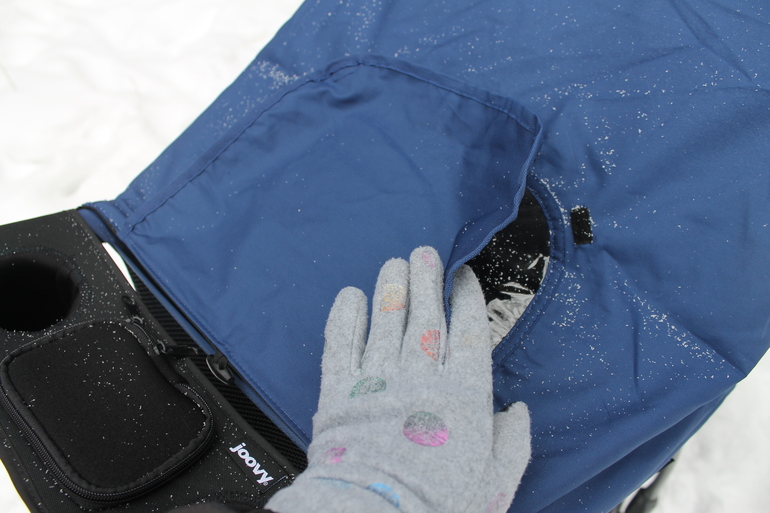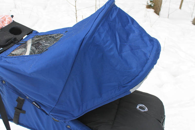 Капюшон большой, с силиконовым окошком для наблюдения за ребенком. Закрывается на липучки; в открытом положении фиксируется симпатичной пуговкой.