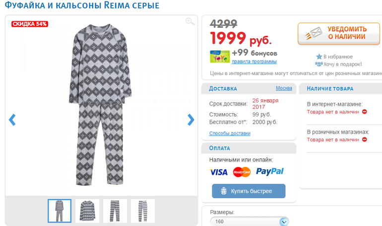 Заказывала себе такое, когда только началась распродажа. Привезли вскрытую коробку без штанов :( А потом размер закончился на сайте :(