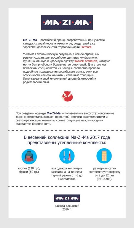 Детская одеждаДевочки, всем добрый день! Ищу зиму детям уже на следующий год. И натолкнулась на фирму MA-ZI-MA. Вроде бы она идет от Premont, но Российского производства. Кто что о ней слышал?