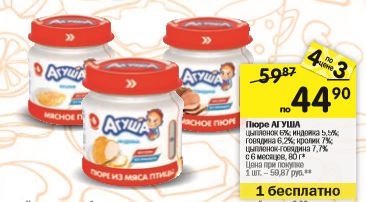 Распродажи. Скидки. Акции.Девочки, в Перекрестке при покупке 4-х банок стоимость мясных пюре 44,9 руб. Это кролик, индейка, говядина. Наиболее выгодно купить пюре кролик, т.к. его стоимость везде 65 руб.