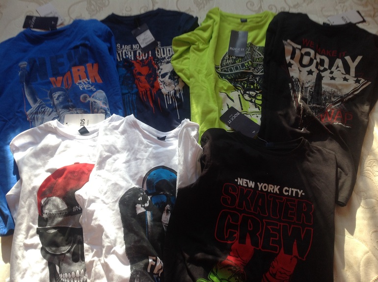 Ну куча маек, из того же Тако по 70 рублей, Ашан, Фамилия.