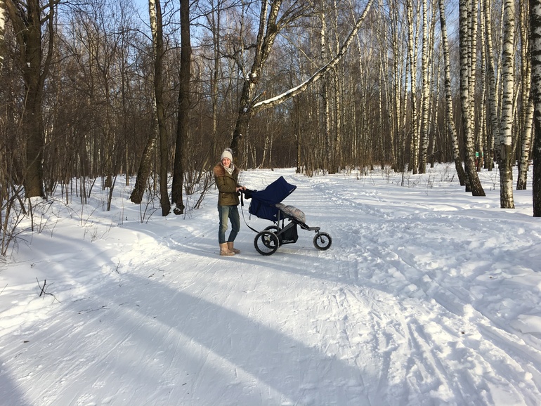 С легкостью вошла в наш маленький лифт по диагонали, еще и мы с мужем поместились. Уже только этих качеств достаточно, чтобы полюбить эту коляску за ее смешные деньги. И это в условиях русской зимы и наших ленивых коммунальщиков. С тевтонией я хожу только по вытоптанным тропам, иначе прогулка превращается в фитнесс, даже при условии блокировки передних колес.