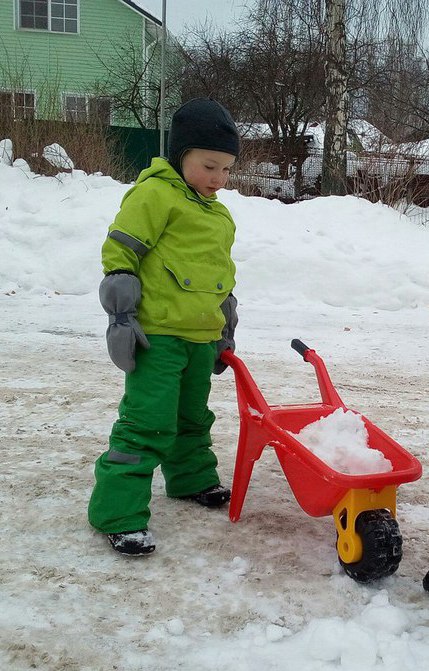 4) Слитный комбинезон мембрана на флисе, без утеплителя. Ходим в нем от -6 до +10 с соответствующими поддевами. Вот сегодня у нас -5 : ушли в нем в садик, под ним слитная поддева из polartec 200.