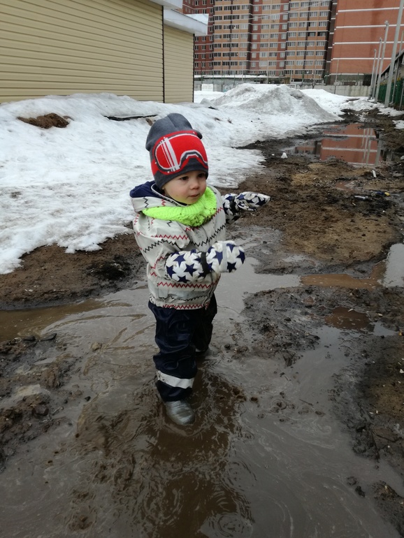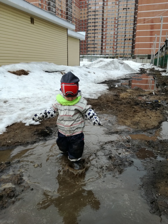 Это не наш двор, просто лужа по пути домой попалась где-то за гаражами, тут только все строится скоро и деревья будут и площадки, в Подмосковье сейчас с этим вроде проблем нет)