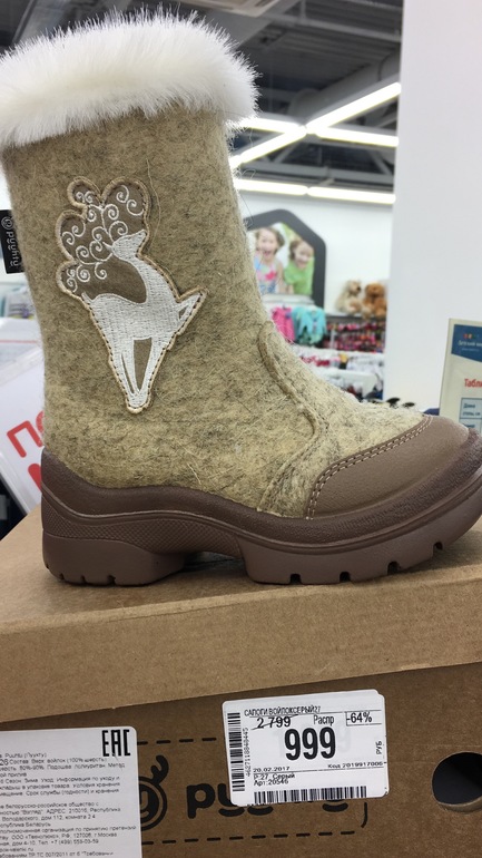А я из-за того, что под брендом Puuhtu даже не стала в их сторону смотреть, не знала, что это белорусы, и купила на след. зиму Котофей - авось угадаю с размером. У нас просто у старшего были сапоги зимние Puuhtu - за полтора месяца раз 10 надел на смену с другими сапогами и отлетела сильно подошва, большая неприятность была, так как надо было еще как-то по снегу с ним из школы домой дойти ((( Сняла у младшей штрипки с комбеза, подвязала подошву и дошли. Puuhtu потому обошла вниманием.