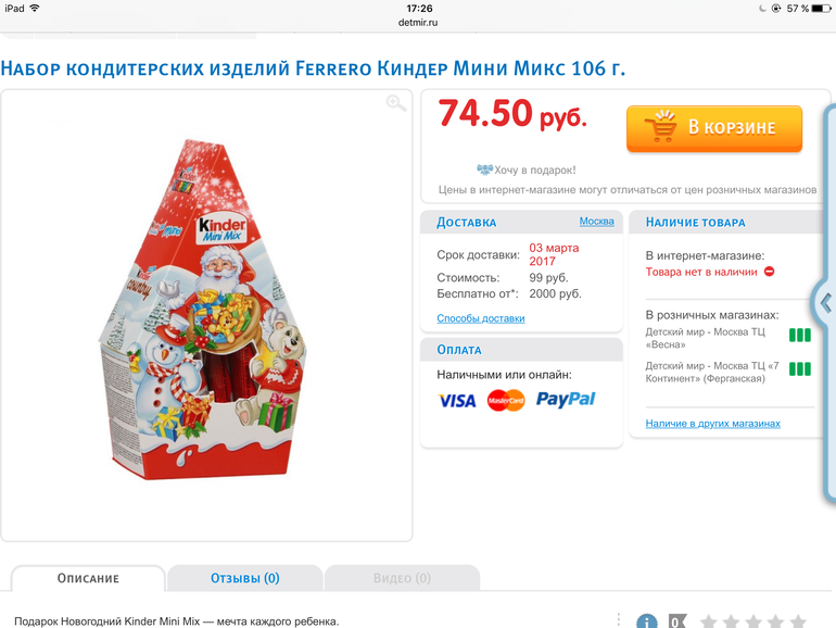 А у меня показывает киндер как товар со скидкой, с перечеркнутой ценой. Светится в наличии, кладу в корзину- всё по нулям. Эх((