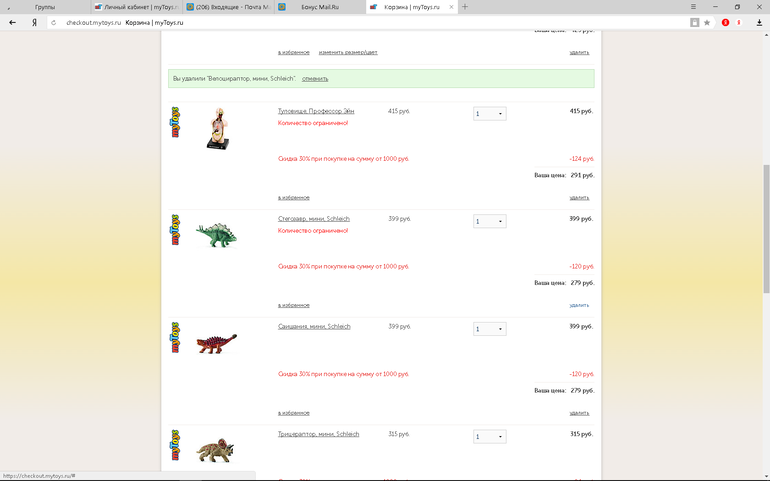 Заходите на сайт БонусМэйл, ищите в списке скидок МайТойс, обнаруживаете два варианта: 15% для новых клиентов, 30% на спецраздел для клиентов МэйлБонус. Переходим прямо с сайта через кнопку "Перейти на сайт", ищем товары, а потом вводим промокод с МэйлБонус.