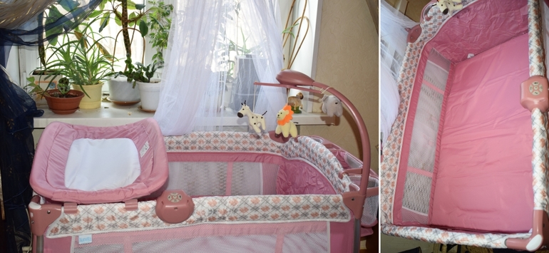 Через эту сетку она, если потребуется, видит маму с папой и ей всегда спокойно. Мне тоже не надо подходить каждый раз к манежу, чтобы посмотреть, как она там спит. Этот манежик очень удобный, он и манеж, и кроватка одновременно, тут даже есть съемный пеленальный столик. Я им часто пользовалась, когда необходимо было сменить подгузник. В нем все продумано, скажем сбоку есть карманы для детской косметики и большие отделения для памперсов. Правда эти карманы не съемные, они отсоединяются вместе с пластиковой подставкой и если нужно постирать, можно приловчиться и стирать все вместе. Но если все делать правильно и не ставить испачканные предметы в кармашки, то и стирать особо не нужно.