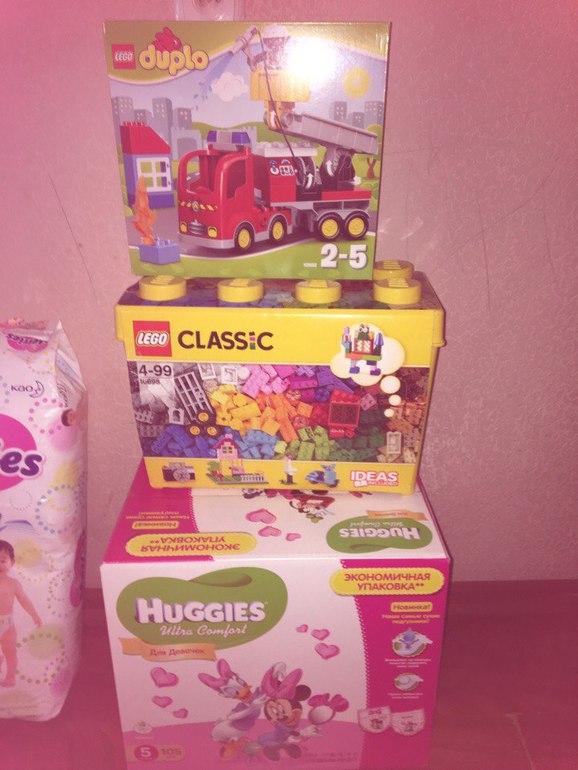 Хаггисы 859 рублей за 105 штук,Лего классик 999 рублей,Дупло 529 рублей.