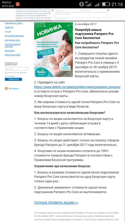 Добрый вечер! Подробно есть на сайте Детского Мира в разделе Акции. А кратко: надо купить новые Pampers Pro Care, написать на них отзыв на сайте ДМ с обязательным указанием номера бонусной карты и Вам вернут стоимость пачки подгузников бонусами на карту. Эти бонусы можно будет потратить только на продукцию Pampers до 31.12.17. Ниже написали, что небезопасно номер своей бонусной карты. Но вроде для списания бонусов нужно ввести код из смс.