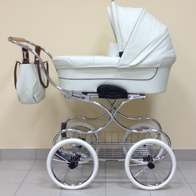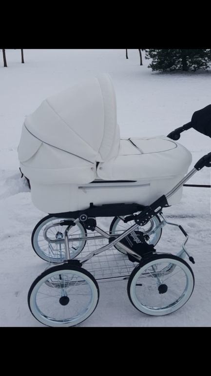 Говорят, узкие и огромные колёса наоборот неудобные, снег на них сильней липнет. Мы взяли Инглезину на шасси эрго байк. Она тоже есть белая, в эко коже. У нас как раз сейчас такая на авито после одного ребенка продаётся.