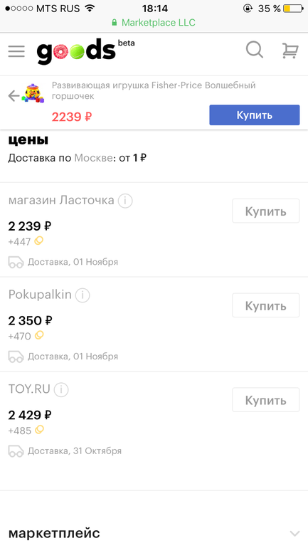 ИгрушкиХочу первый раз заказать игрушку в гудз. Подскажите пожалуйста, выбирать самую дешёвую цену или как? Мне почему то toy.ru внушает доверие
