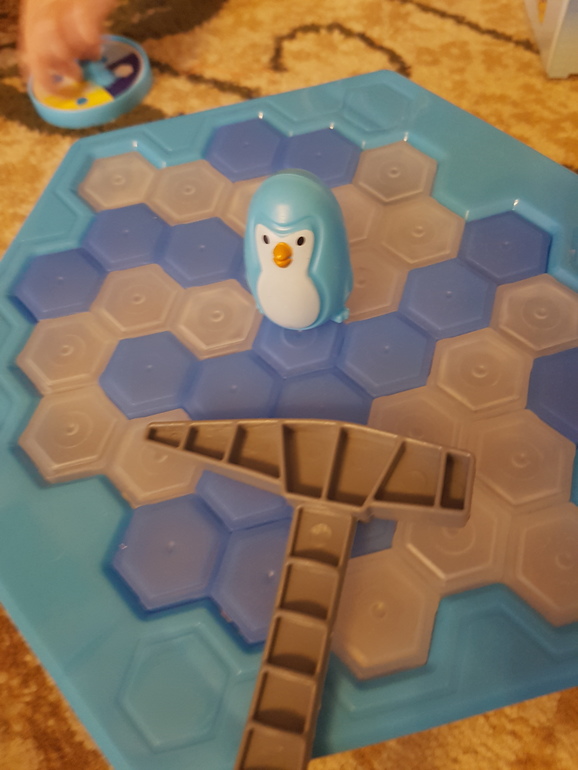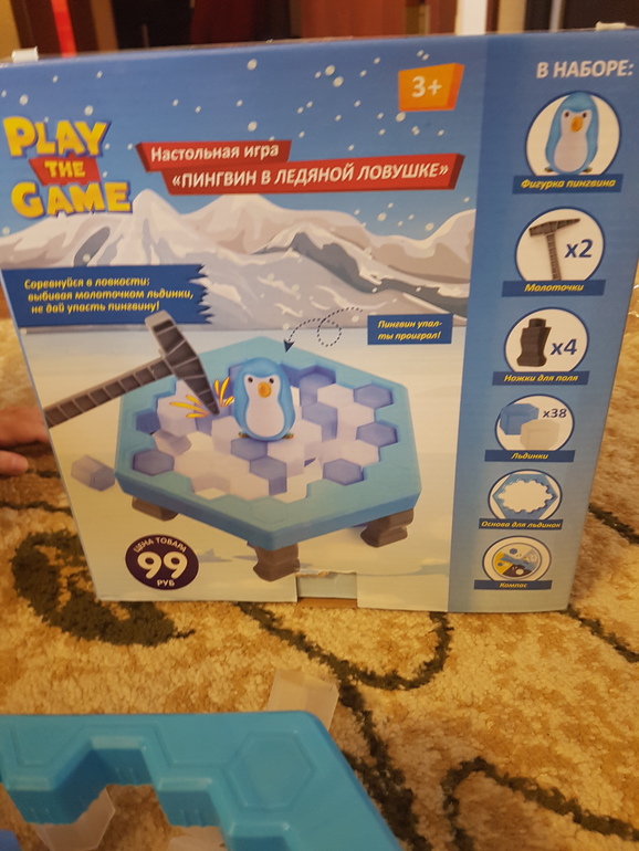 У нас такая игра из Майшопа, очень классная штука. Сын с 2 лет играет почти по правилам (не крутим стрелку, а бьем по очереди). Эта мне даже больше нравится, пингвин симпатичнее, и поле, кажется меньше (быстрее собирать). Эх, может еще купить,на дачу.
