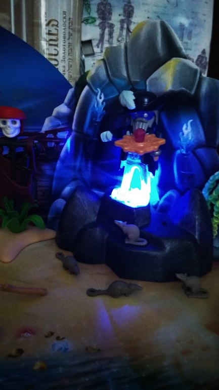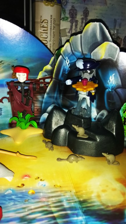 А вот и он-призрак пирата по имени Крюк,охраняющий сундук с золотом) 😱 В руке держит золотое украшение с рубином,а рядом с ним на шесте весит черепушка,видимо тоже его))) 💀