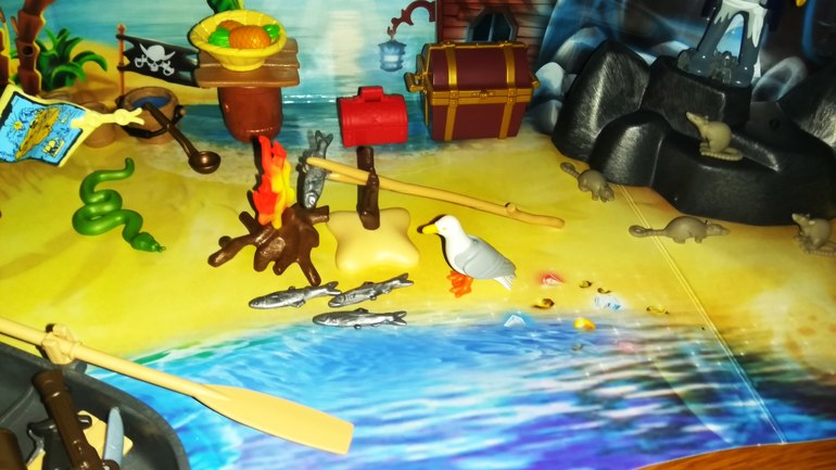 Собрав весь набор видим,как на лодке на таинственный остров приплыл пират,в руках у него имеется карта сокровищ