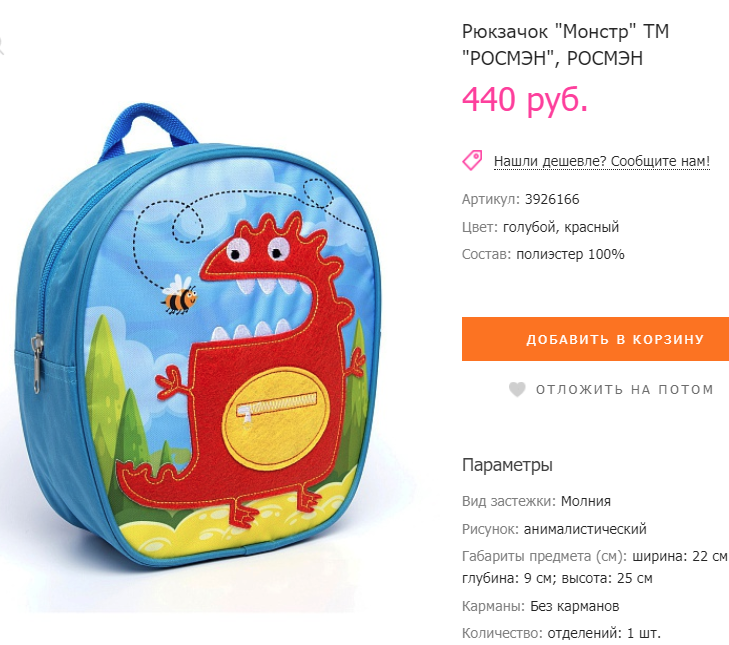 Покупала в детском мире по акции рублей за 150. Сейчас дороже. Умещается почти а4. В использовании уже больше чем полгода. Младшей покупала за компанию. С полутора таскает этот рюкзак. Замки целы. Ткань без повреждений. Носят постоянно. Не промокают. Картинки не стерлись. У нас с кошкой, с зайкой и с машинкой. Вроде еще динозавр был.