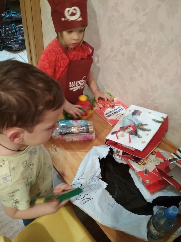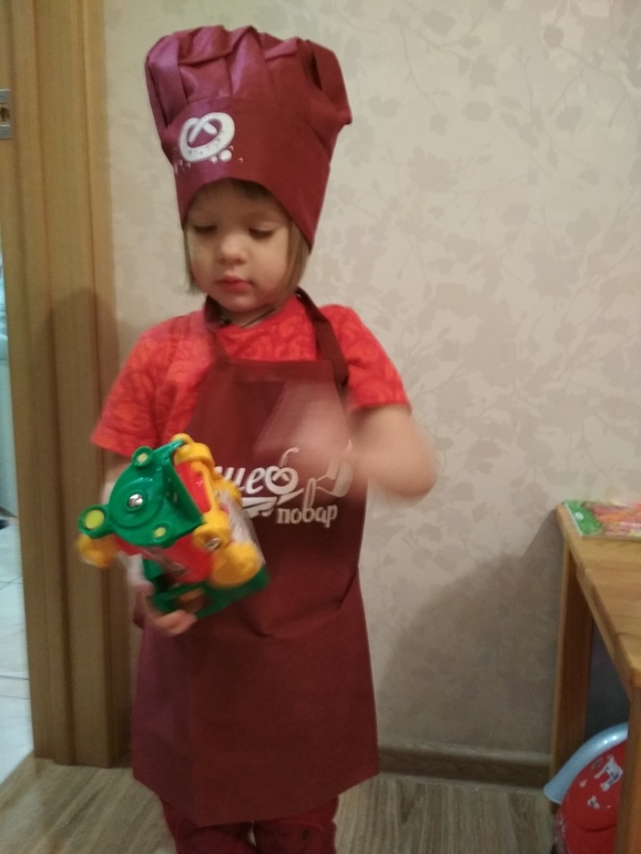 Все для детского праздника+наши фотохвастыВот и мы получили посылку от нашей милой Снегурочки (не смогла определить по нику в сообе). Детям все оочень понравилось. Ульяна тут же надела фартук и "шапку" и сказала, что будет пирожки делать, а потом попросилась и обедать в наряде.
