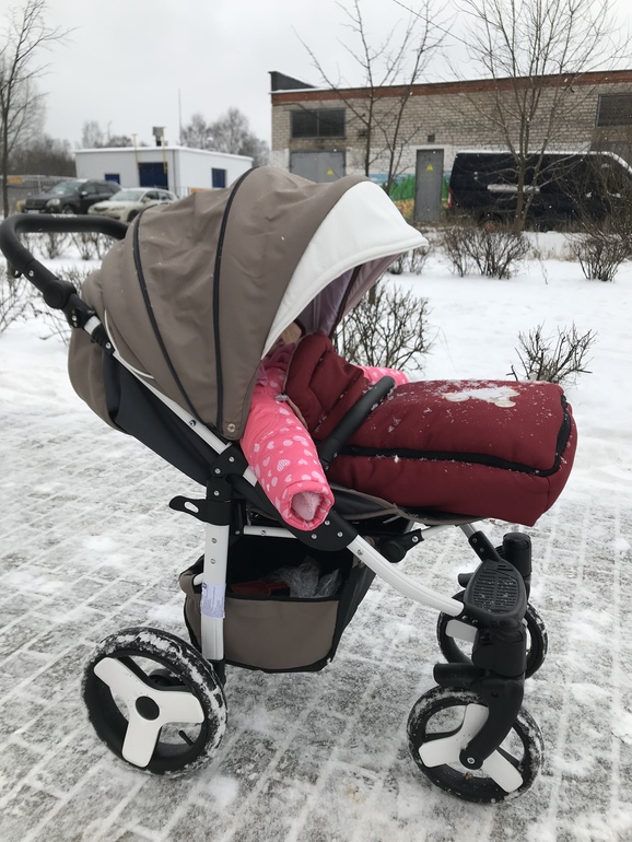 Есть роскошная зимняя прогулочная коляска, супер вездеход Актив3. Колёса большие, амортизация сказочная, маневренность прекрасная. А какой капюшон! Я такого большого теплого капа больше нигде не видела. Управляется легко, на поворотах как пушинка. И, главное, на нашу зиму подходит: тёплая, да и по сугробам пройдёт, если переднее поворотное колесо зафиксировать.