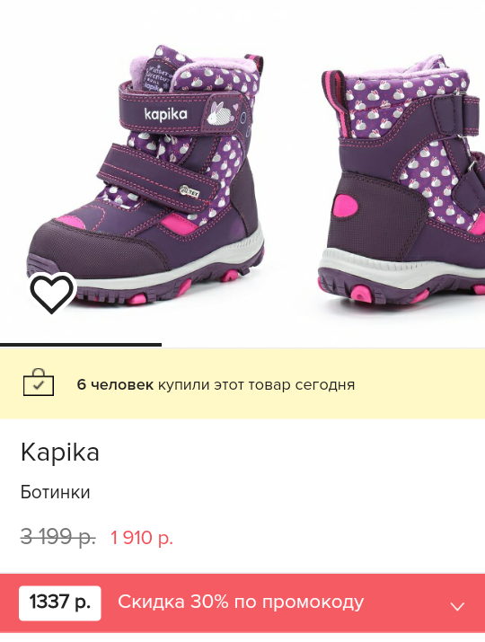 У нас такие капика, брали осенью по такой цене. Во-первых, мне показались маломерками, хотя, может это из-за овчины внутри. Ну и ножка в них потеет. Однако, за 1300 - чому б ни?